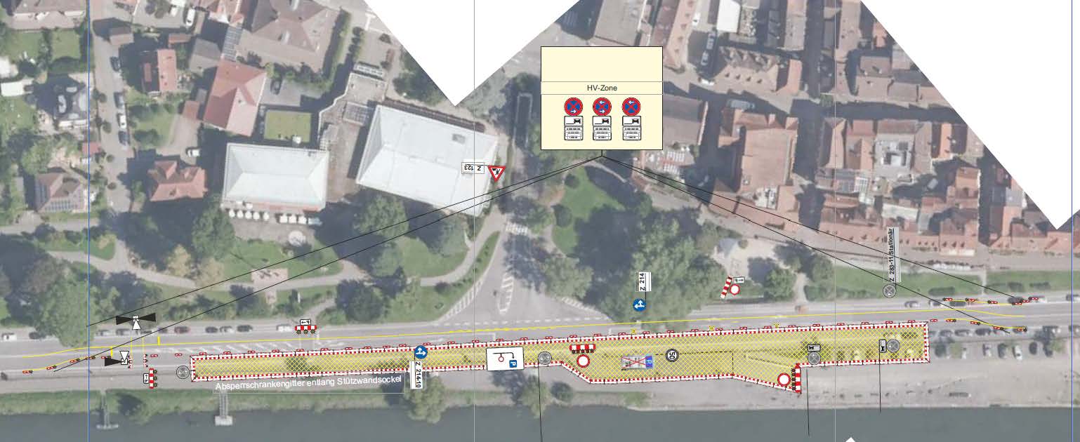 Die Arbeiten werden unter Verengung beider Fahrspuren durchgeführt, sodass keine Umleitungen erforderlich sind. Es entfallen die Längsparkplätze entlang der B 37 sowie die Parkplätze unterhalb der Stützmauer. Das Hafengebiet ist für Fahrzeuge während dieser Phase nur über die zweite Zufahrt im Bereich der Neckarbrücke erreichbar.