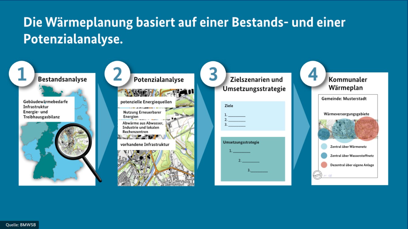 Die kommunale Wärmeplanung erfolgt schrittweise. Zu Beginn erfasst die Bestandsanalyse den aktuellen Wärmebedarf der Gebäude und stellt dar, wie dieser bislang gedeckt wird. Im zweiten Schritt erfolgt eine Potenzialanalyse. Diese bewertet Einsparpotenziale durch Gebäudesanierungen und erfasst die vorhandenen Ressourcen erneuerbarer Energiequellen und mögliche Abwärmepotenziale. Basierend auf diesen Vorarbeiten werden in einem dritten Schritt Eignungsgebiete für die zukünftige Versorgung über Wärmenetze und dezentrale Einzelversorgung erarbeitet.