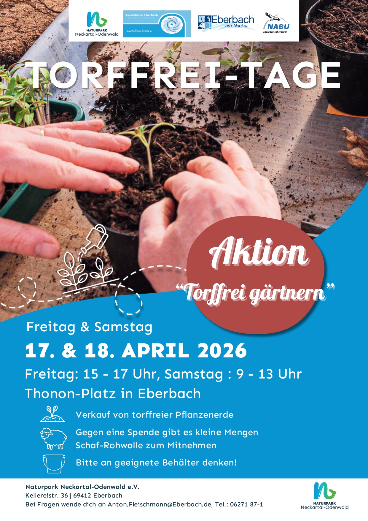 Im Rahmen der bundesweiten Aktion „Torffrei gärtnern“ bietet der NABU Eberbach-Schönbrunn gemeinsam mit der Stadt Eberbach torffreie Pflanzerde zum Verkauf an. Die Erde wird von der Abfallwirtschaft Neckar-Odenwald-Kreis (AWN) in Buchen bezogen.