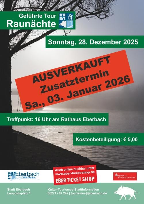 Die Tourist-Information der Stadt Eberbach bietet am Samstag, den 03.01.2026 eine Führung zum Thema Raunächte an. Beginn ist um 16:00 Uhr bei der Tourist-Information am Rathaus in Eberbach. Die Tour dauert ca. 90 Minuten.