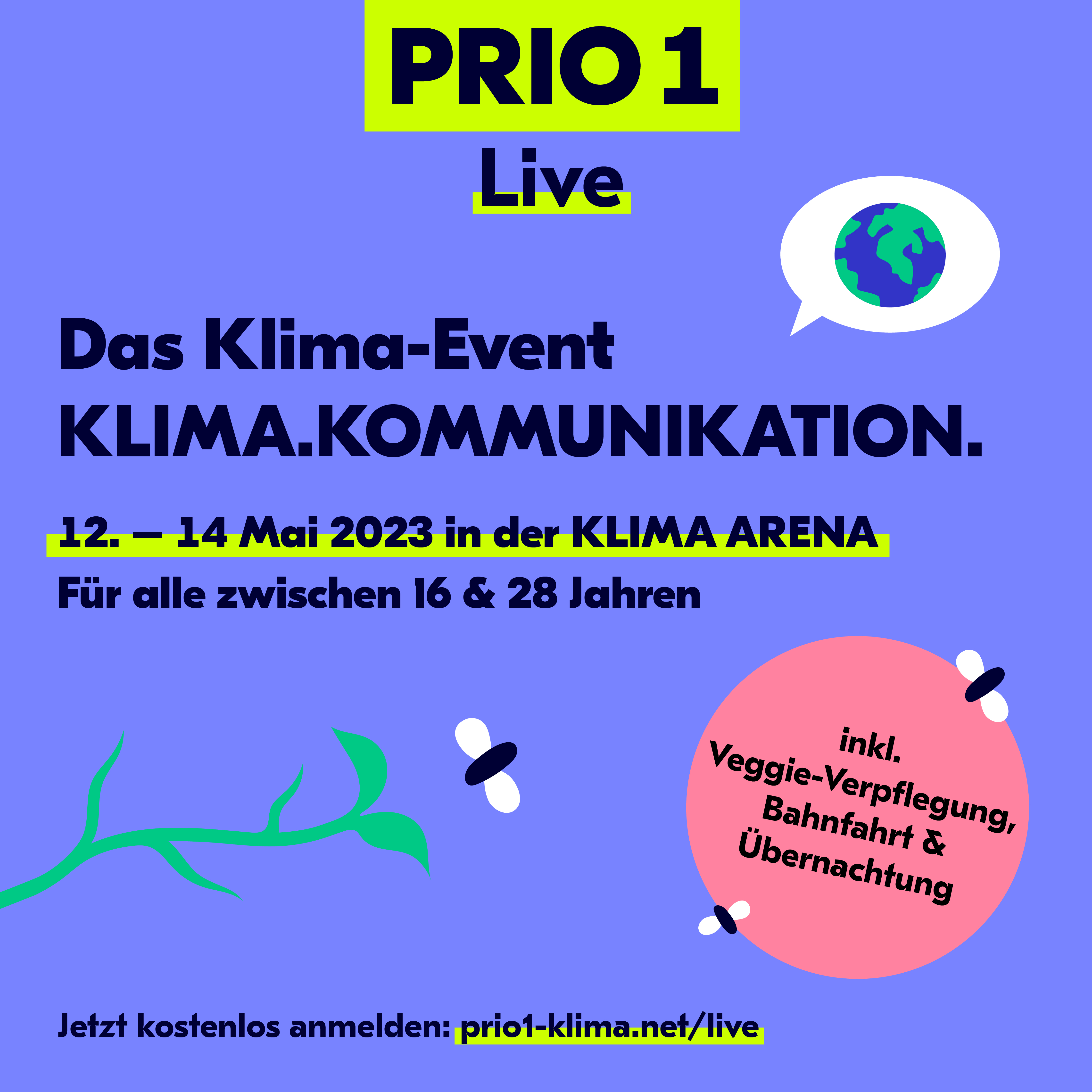 PRIO1 – Das Klima-Netzwerk lädt auch in diesem Jahr wieder alle 16- bis 28-jährigen Klimabegeisterten zum Live Event ein. Die Veranstaltung findet vom 12. bis 14. Mai in der Klima Arena in Sinsheim statt – diesmal rund um das Thema Klimakommunikation. Wieder stehen diverse Workshops, Podiumsdiskussionen und Austauschrunden auf dem Programm unter anderem zu Themen der Klimapsychologie, Klimakommunikationen zwischen den Generationen oder zum Thema Bildung im Klimaschutz.Wichtige Infos im Überblick: 12.-14. Mai 2023 in der Klima Arena in SinsheimThema: KlimakommunikationFür alle 16- bis 28-jährigen KlimabegeistertenTeilnahme kostenfrei Inkl. Bahnfahrt, Veggie-Verpflegung und bei Bedarf Übernachtung in der Jugendherberge Heidelberg.Anmeldung jetzt über prio1-klima.net/live