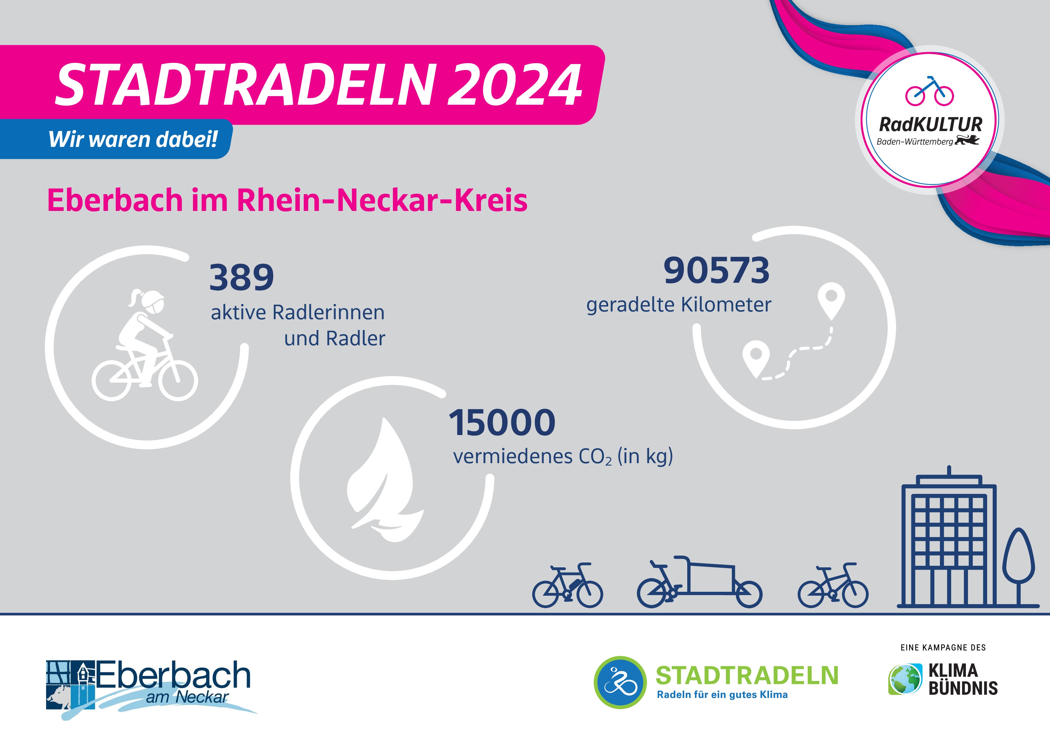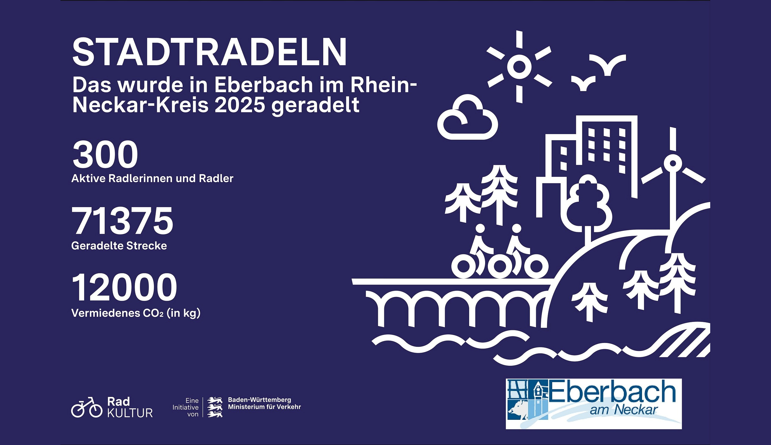 Eberbach erzielte beim Stadtradeln 2025, vom 29.06. – 19.07.2025, mit 71.375 gefahrenen Kilometern den 11. Platz im Rhein-Neckar-Kreis. Mit 300 aktiven Radelnden in 21 Teams konnte man zwar den 6. Platz aus dem Vorjahr nicht mehr verteidigen, aber immer noch ein beachtliches Ergebnis erzielen.