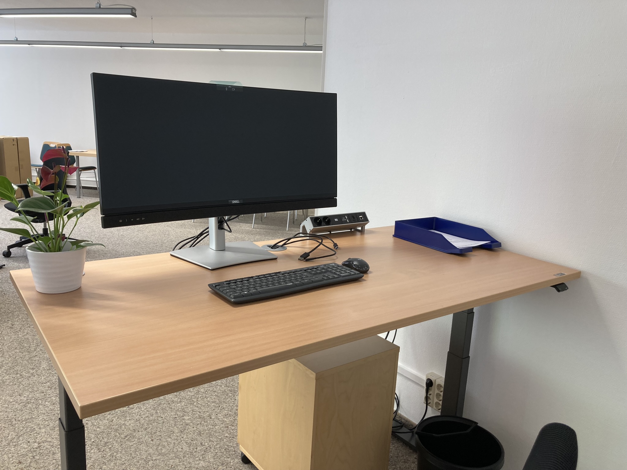 - Sechs höhenverstellbare Schreibtische (65-125cm) und Bürostühle mit Netzrücken.