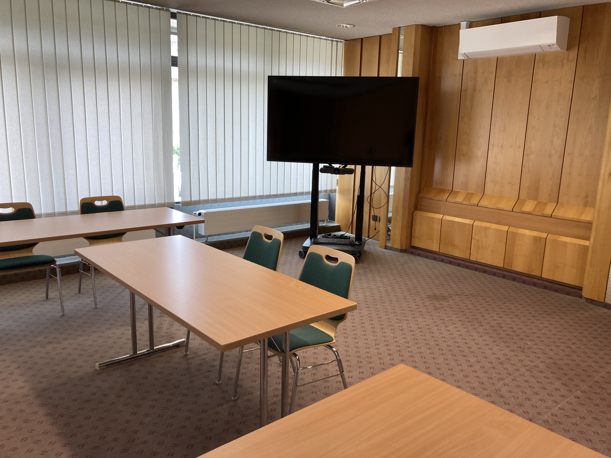 Das Konferenzzimmer im ersten Stock der Stadthalle ist über einen Aufzug barrierefrei zugänglich und bietet Platz für bis zu 50 Personen (je nach Bestuhlungsvariante). Der klimatisierte Raum ist mit einem 75 Zoll großen Bildschirm und Flipchart ausgestattet und somit für kleinere Vorträge oder Schulungen bestens geeignet.