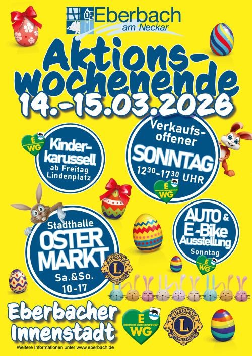 Zum verkaufsoffenen Sonntag lädt von 12:30 bis 17:30 Uhr die Eberbacher Werbegemeinschaft ein. Produkte passend zur Jahreszeit werden von den Händlern in und vor ihren Geschäften und an Ausstellungsständen angeboten. Ebenso präsentieren sich ortsansässige Autohäuser an diesem Tag auf dem Leopoldsplatz. Ergänzt wird die Ausstellung durch die Vorstellung von E-Bikes bekannter Marken.Wer sich beim Möbelhaus Söhner an diesem Tag ein neues Möbelstück zulegt, spart sich sogar die Lieferkosten.