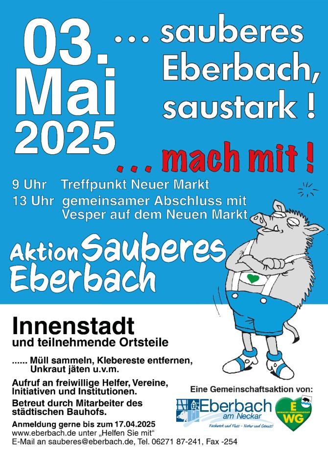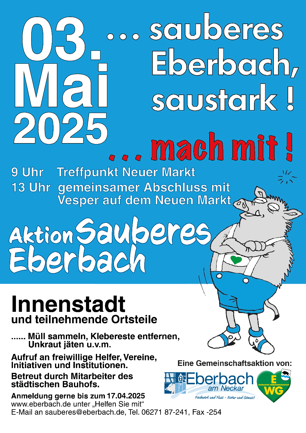 Die Stadtverwaltung Eberbach und die Eberbacher Werbegemeinschaft EWG haben sich für 2025 darauf verständigt, wieder die Aktion Sauberes Eberbach durchzuführen. Die Aktion findet am Samstag, dem 3. Mai statt. Vorgesehen ist der Zeitraum von 9 bis 13 Uhr.