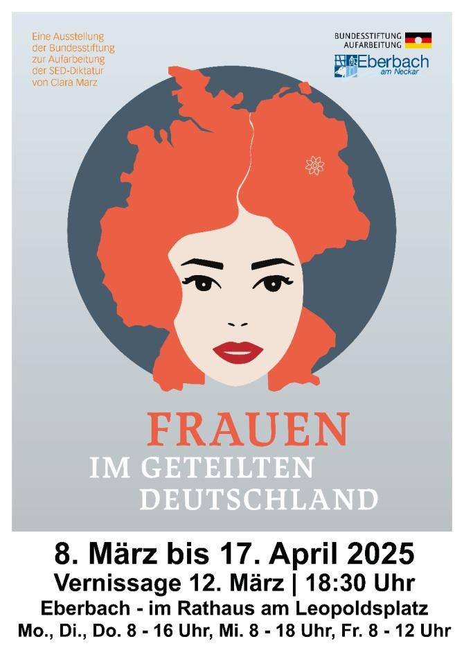 Die Stadt Eberbach präsentiert die Ausstellung „Frauen im geteilten Deutschland“. Am Mittwoch, dem 12. März 2025 findet um 18:30 Uhr eine offizielle Eröffnung mit Live-Musik von dem Duo Hearts and Bones statt.