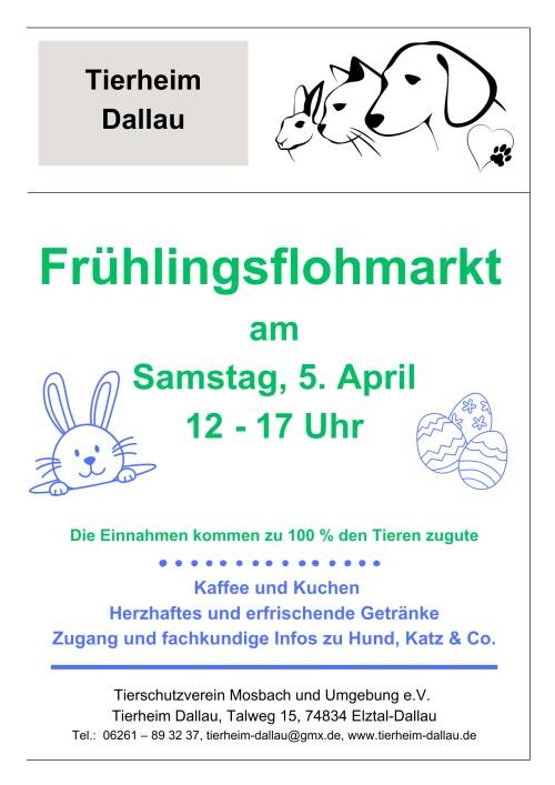 Am Samstag, den 5. April findet der Frühlingsflohmarkt im Tierheim Dallau statt. Von 12 bis 17 Uhr sind die Tore für die kleinen und großen Besucher*innen geöffnet.