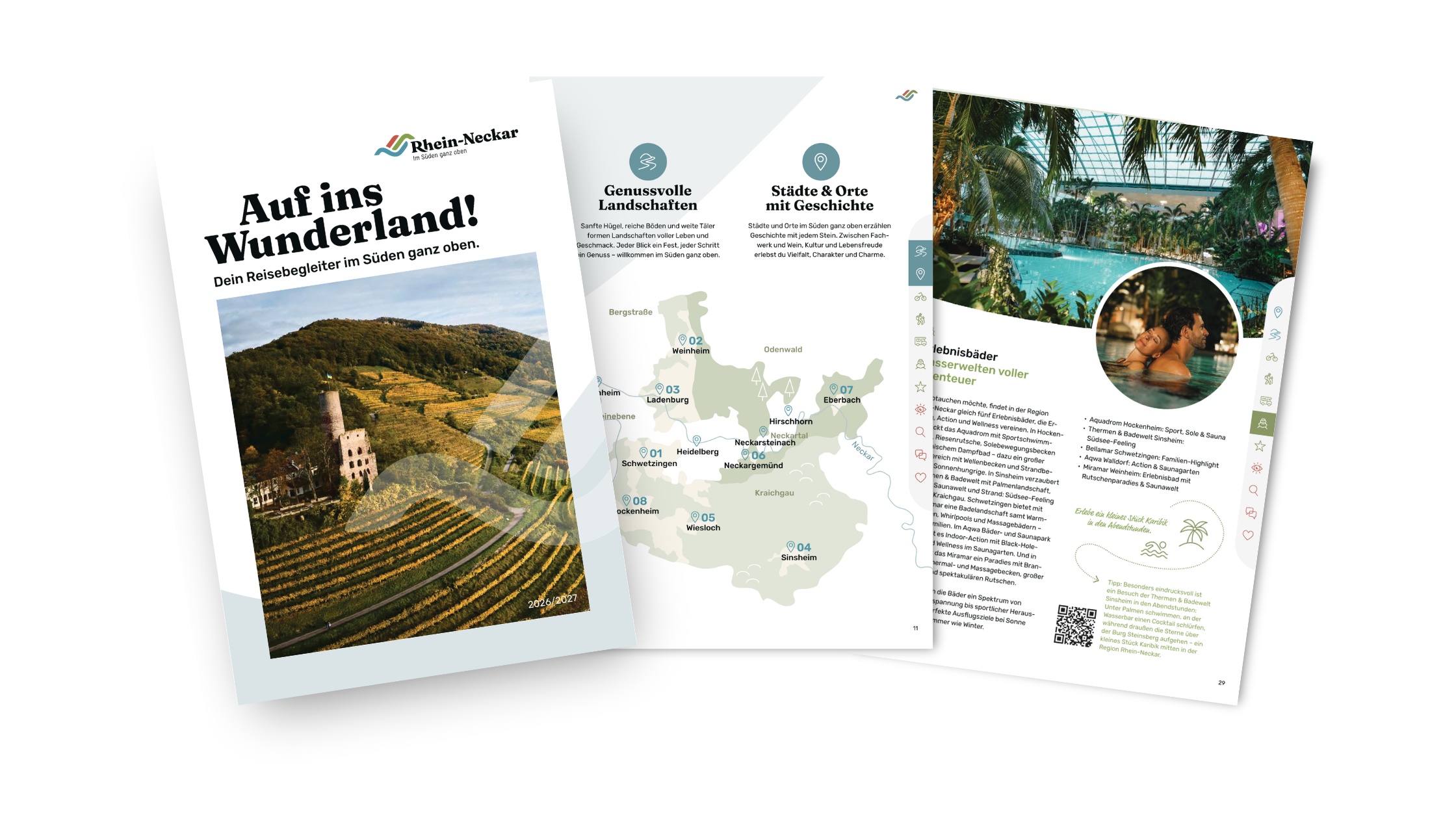 „Auf ins Wunderland“ bietet pralle 64 Seiten mit einem grundlegenden Überblick über die verschiedenen Regionen des Kreises – Kraichgau, Oberrheinebene, Bergstraße und Odenwald werden hier mit ihren jeweiligen Eigenheiten liebevoll charakterisiert. Touristische Hotspots wie Schwetzingen, Ladenburg und Neckargemünd erhalten eine Bühne, aber die Broschüre arbeitet nicht nur Ortschaften durch: Interessierte können in den Kategorien „Sehenswertes“, „Entdeckenswertes“, „Begegnungen“ und „Lieblingsmomente“ entscheiden, wonach ihnen der Sinn steht. Oder sie erfahren, wie sie sich am besten durch den Kreis bewegen: per Rad, zu Fuß, im Wohnmobil, auf dem Wasser – oder gar mit dem Alpaka.