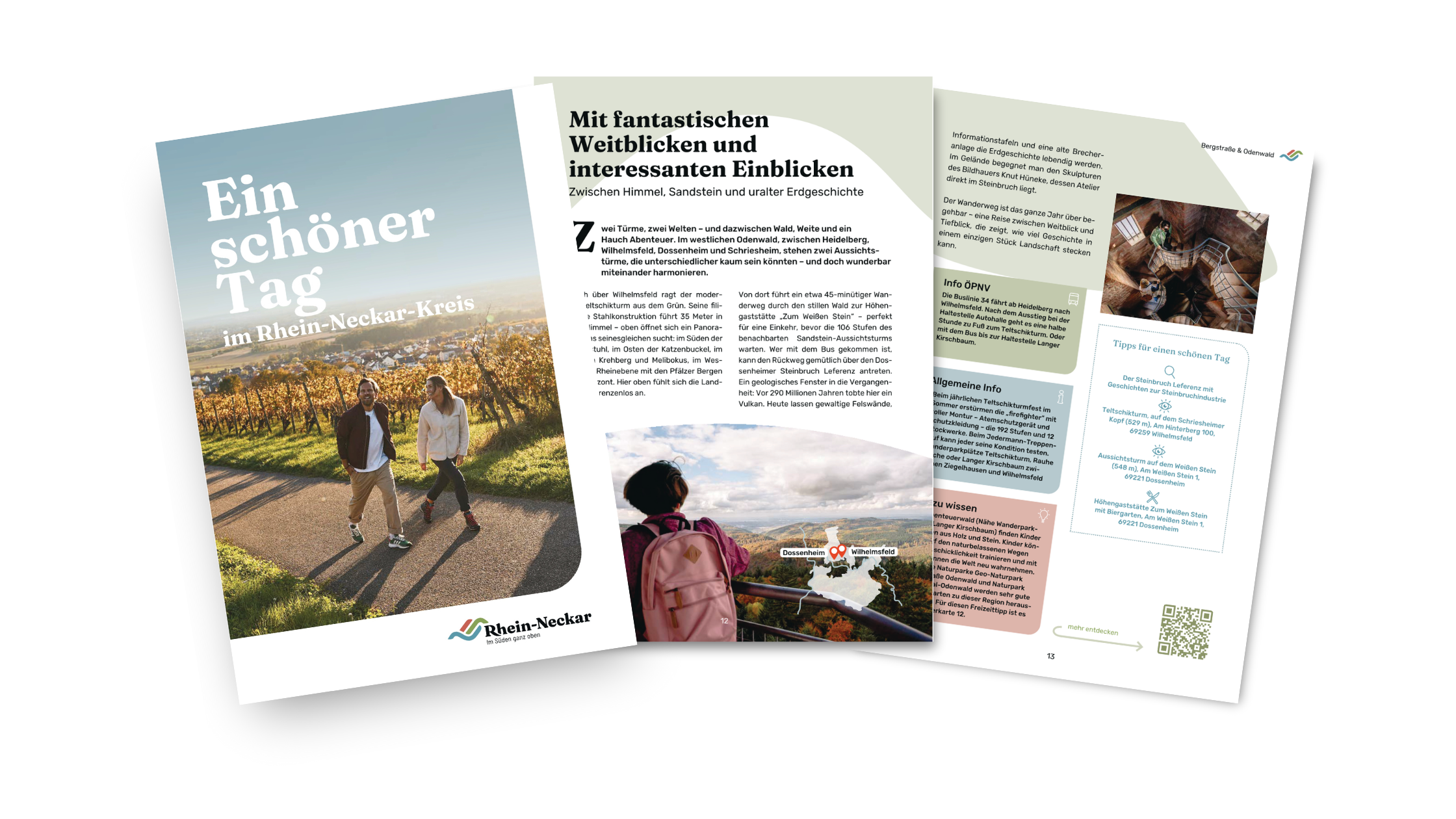 Die beiden Publikationen bedienen unterschiedliche Zielgruppen: „Während sich ‚Auf ins Wunderland‘ vor allem an Touristen aus ganz Deutschland richtet, bietet ‚Ein schöner Tag‘ Ideen für Tagesausflüge und stellt die kleinen Perlen der Region vor, die oft auch Einheimische erst noch entdecken dürfen“, sagt die Tourismusbeauftragte des Kreises Beate Otto. Auf 48 Seiten gibt es in „Ein schöner Tag“ zahlreiche Möglichkeiten, sich „im Tag zu verlieren“: Von Ort zu Ort wandert die Broschüre durch den Rhein-Neckar-Kreis und gibt Ausflugstipps: Für PS-Fans etwa nicht nur den wohlbekannten Hockenheimring, sondern auch die „Autovision“ im benachbarten Altlußheim mit außergewöhnlichen Sonderausstellungen und Technik zum Anfassen. Naturbegeisterte bekommen Wandertipps durchs Steinachtal oder werden in den „Amazonas des Kraichgaus“ auf die Elsenz geschickt. Und natürlich sind auch vielfältige Anregungen für Ausflüge mit Kindern enthalten. Dazu gibt es auf jeder Doppelseite interessante Zusatzinfos von Anreisemöglichkeiten mit dem ÖPNV bis zu Gastro-Empfehlungen vor Ort.